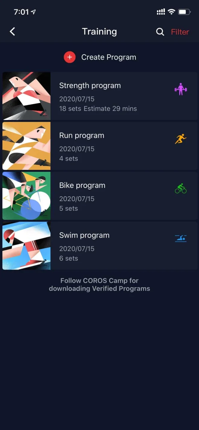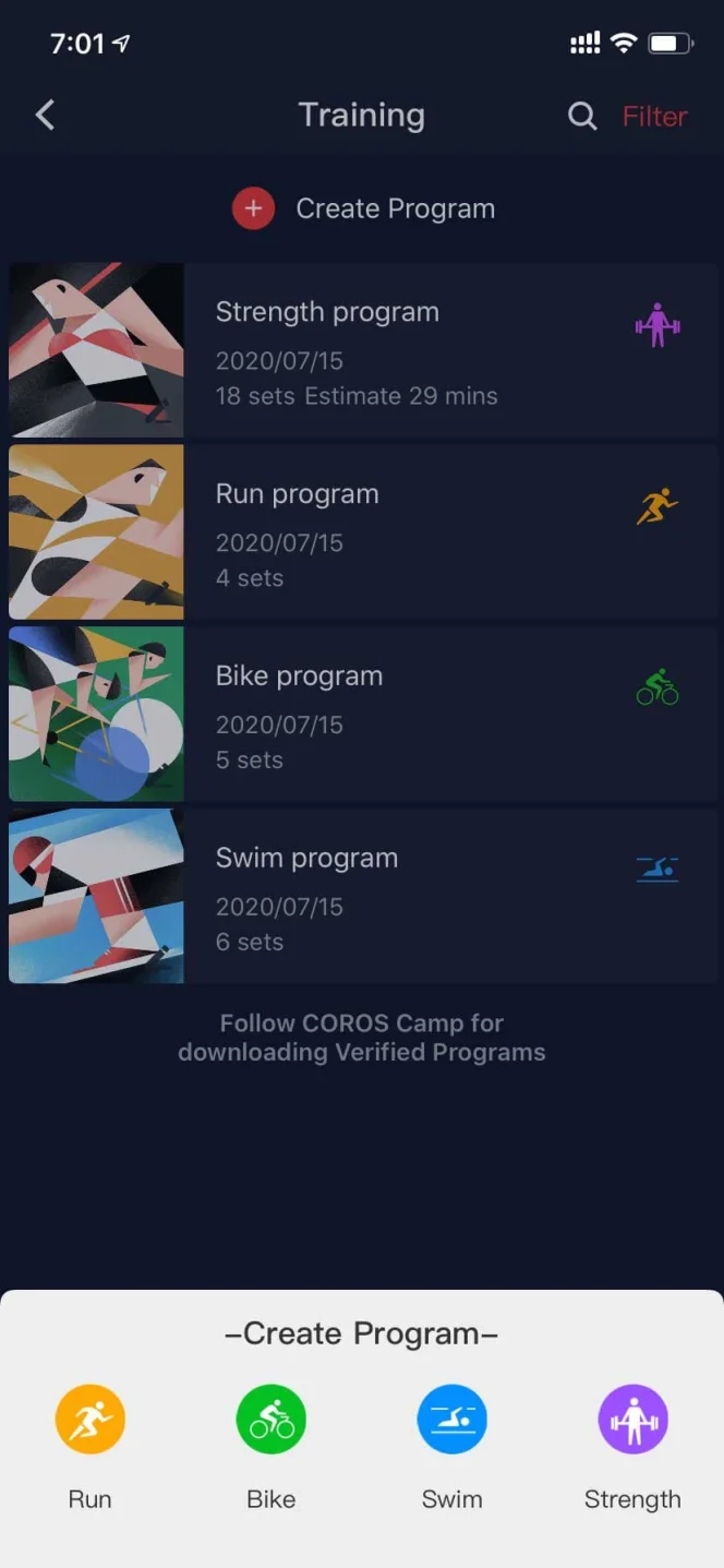 使用COROS训练模式可以让你在App中建立跑步,骑车,游泳或力量训练导入手表进行训练。上百种训练动作库,可自由创建训练项目,如私教般指导每一次训练。微信公众号“COROS高驰”将会定期发布由专业运动员和教练制作的训练计划,你也可以通过微信与其他运动爱好者一起分享你喜欢的训练计划。