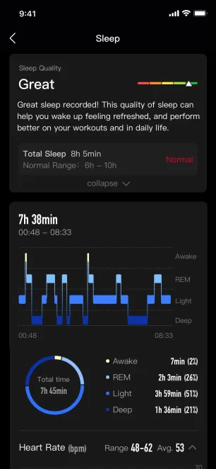 COROS 支持监测全天睡眠,并有睡眠质量评估,帮你了解徒步期间的休息情况。
