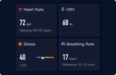 仅需在安静状态测量 30 秒左右获取:心率、HRV、压力、呼吸频率、血氧饱和度等数据,帮你长期监测身体健康状态。